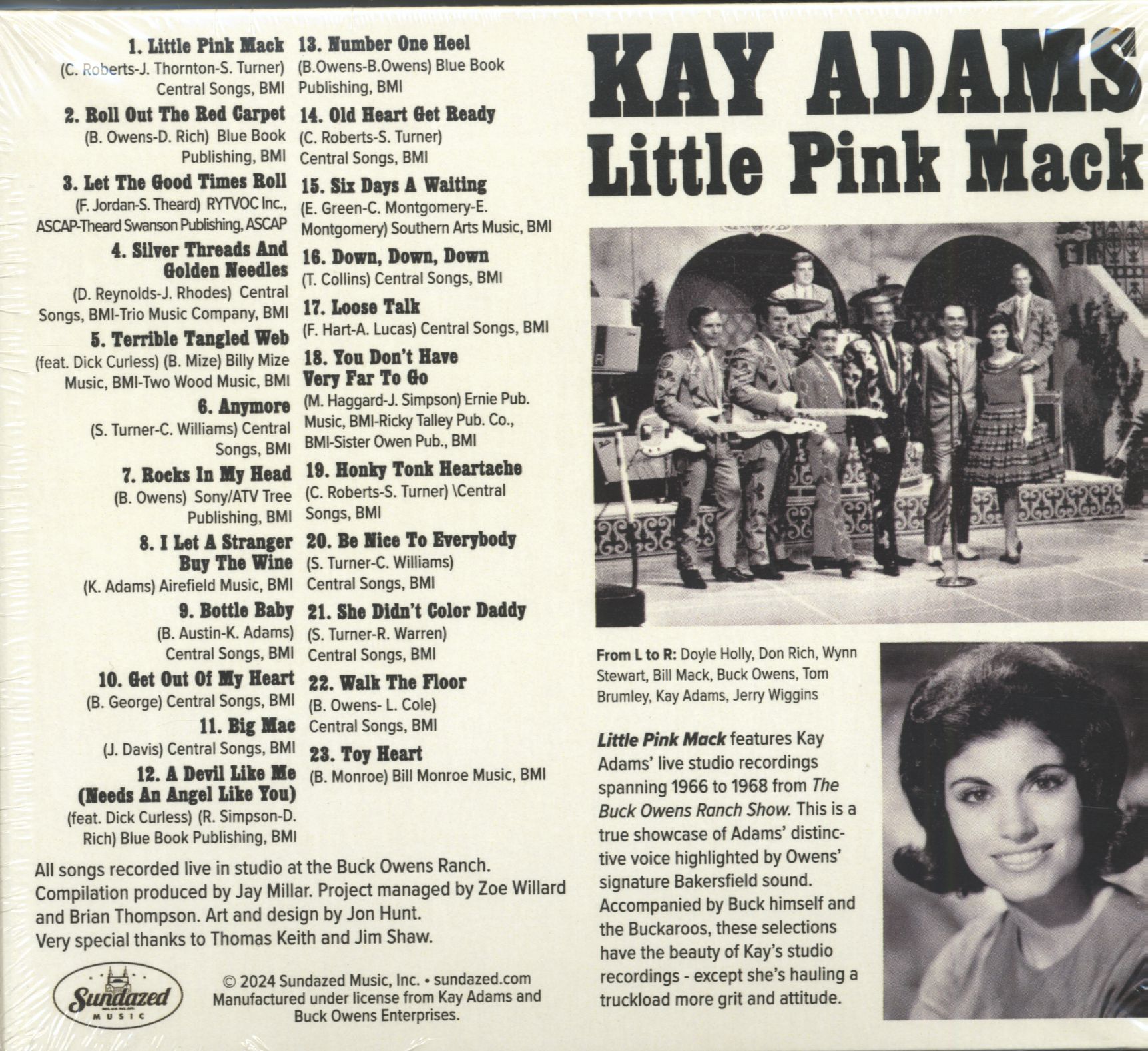 This album collects Kay Adams' live studio recordings from the Buck Owens Ranch Show. Along with Tammy, Patsy and Loretta, Kay Adams was one of the first female country artists to pave the way for women in the genre. This gritty and bone-rattling country record is a real head-turner!