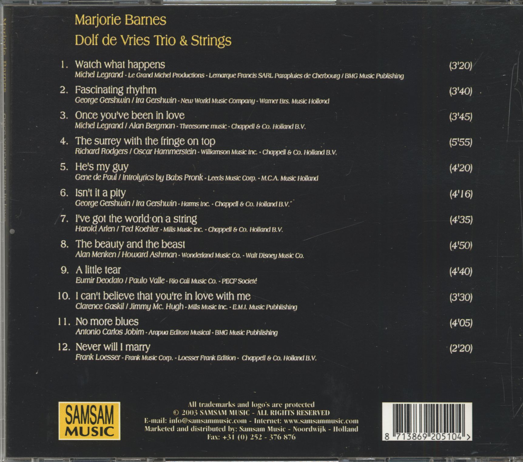 Once You've Been In Love is a wonderful easy listening / smooth jazz album by Marjorie Barnes (USA). Her good looks, great voice and professionalism make her an artist of international standing. Her collaboration on this album with the Dolf de Vries Trio, Toots Thielemans and Bob Schimscheimer guarantees beauty and success.