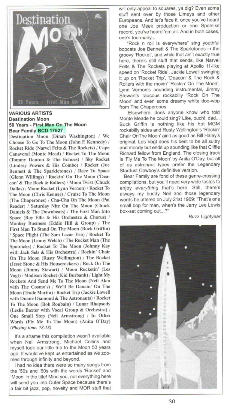 Elsewhere, does anyone know who told Monte Meade he could sing? Like, ouch!, dad... Buck Griffin is nothing like his hot MGM rockabilly sides and Rusty Wellington's 'Rockin' Chair OnThe Moon' ain't as good as Bill Haley's original. Les Vogt does his best to be all sultry and moody but ends up sounding like that Cliffie Richard fellow from England. The closing track is 'Fly Me To The Moon' by Anita O'Day, but all of us astronaut types prefer the Legendary Stardust Cowboy's definitive version. Bear Family are fond of these genre-crossing compilations, but you'll need very wide tastes to enjoy everything that's here. Still, there's always my buddy Neil and those legendary words he uttered on July 21st 1969: "That's one small bop for man, when's the Jerry Lee Lewis box-set coming out...?"