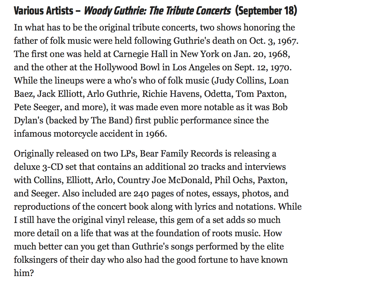 Various Artists – Woody Guthrie: The Tribute Concerts (September 18)