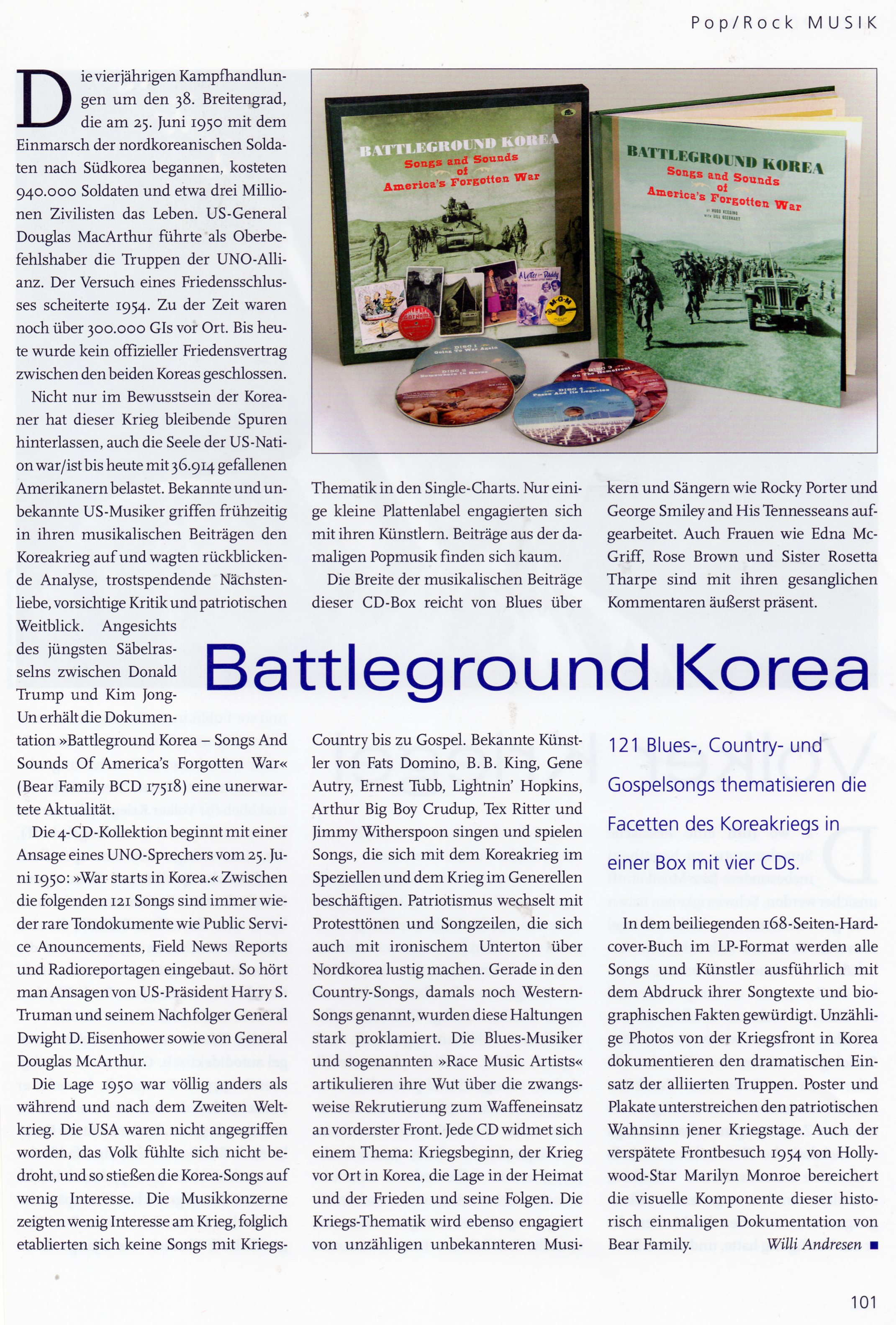 In the enclosed 168-page hard-cover book in LP format, all songs and artists are honoured in detail with their lyrics and bio-graphical facts. Countless photos of the war front in Korea document the dramatic deployment of the Allied troops. Posters and posters underline the patriotic madness of those days of war. Hollywood star Marilyn Monroe's late visit to the front in 1954 also enriches the visual component of this historically unique documentary by Bear Family. Willi Andresen