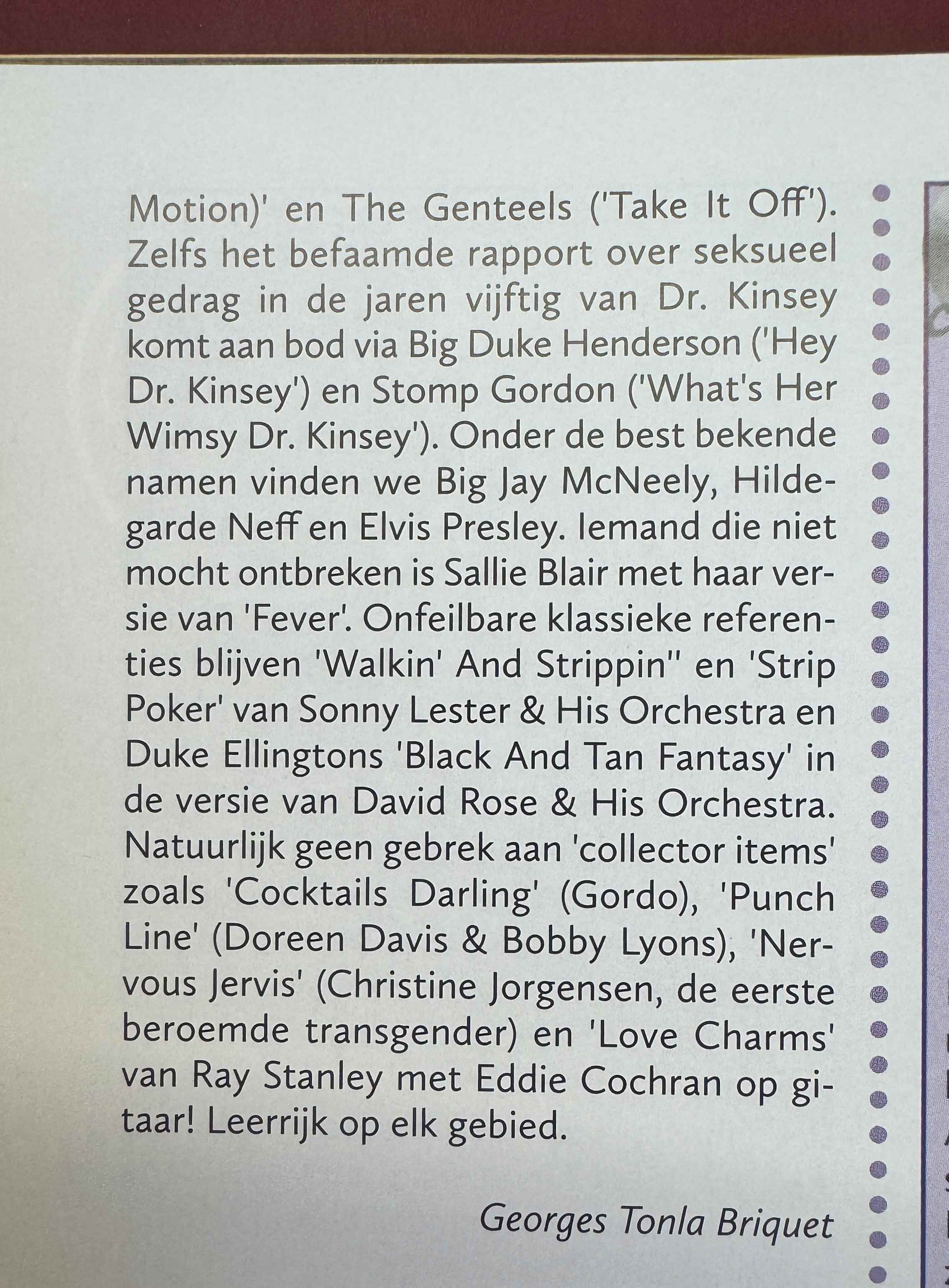 Even Dr. Kinsey's famous report on sexual behavior in the 1950s is covered by Big Duke Henderson ('Hey Dr. Kinsey') and Stomp Gordon ('What's Her Wimsy Dr. Kinsey'). Among the best known names are Big Jay McNeely, Hildegarde Neff and Elvis Presley. Someone who could not be left out is Sallie Blair with her version of 'Fever'. Infallible classic references remain 'Walkin' And Strippin” and ‘Strip Poker’ by Sonny Lester & His Orchestra and Duke Ellington's ‘Black And Tan Fantasy’ in the version by David Rose & His Orchestra.