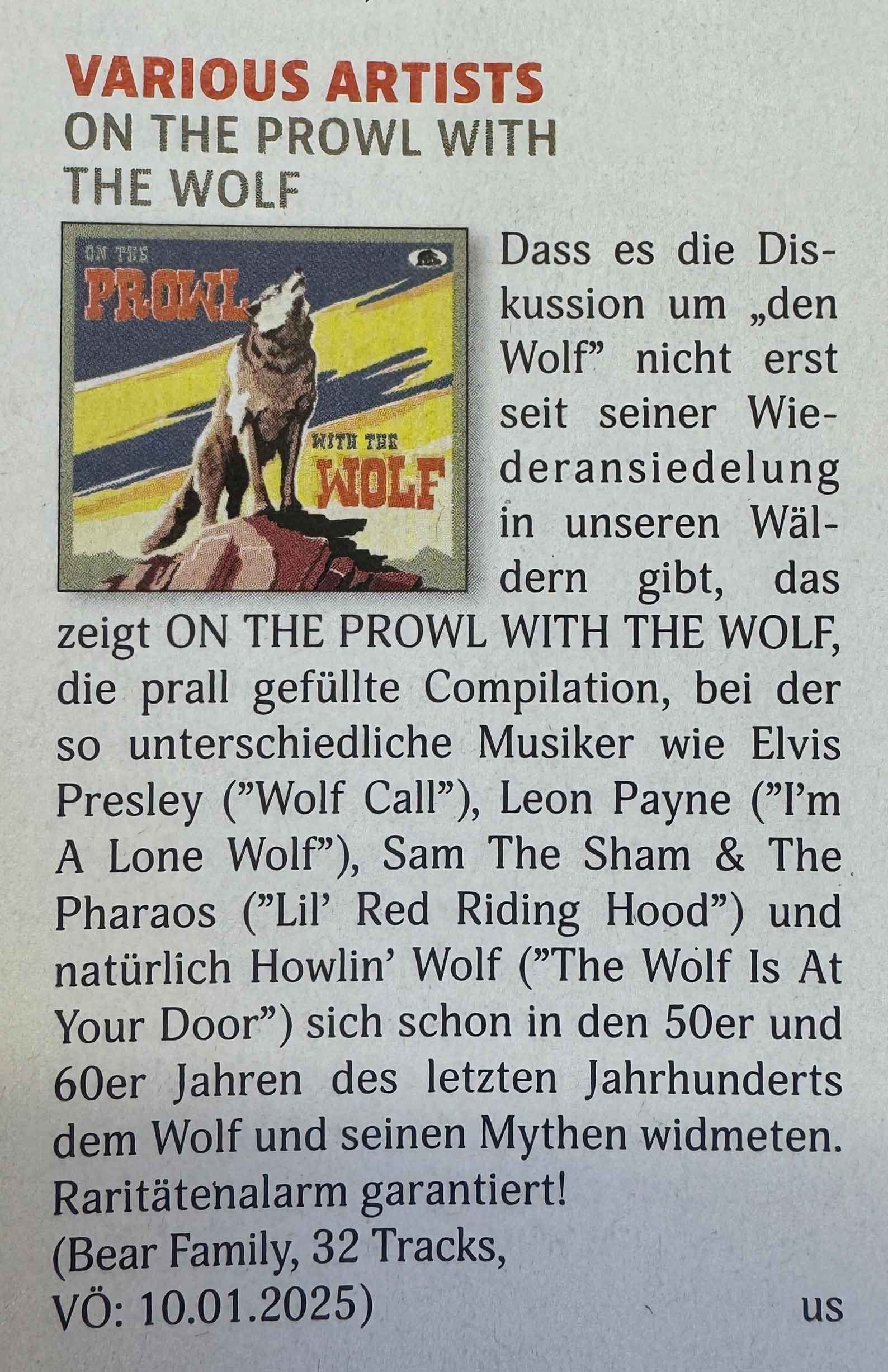 zeigt ON THE PROWL WITH THE WOLF, die prall gefüllte Compilation, bei der so unterschiedliche Musiker wie Elvis Presley ("Wolf Call"), Leon Payne ("Im A Lone Wolf"), Sam The Sham & The.