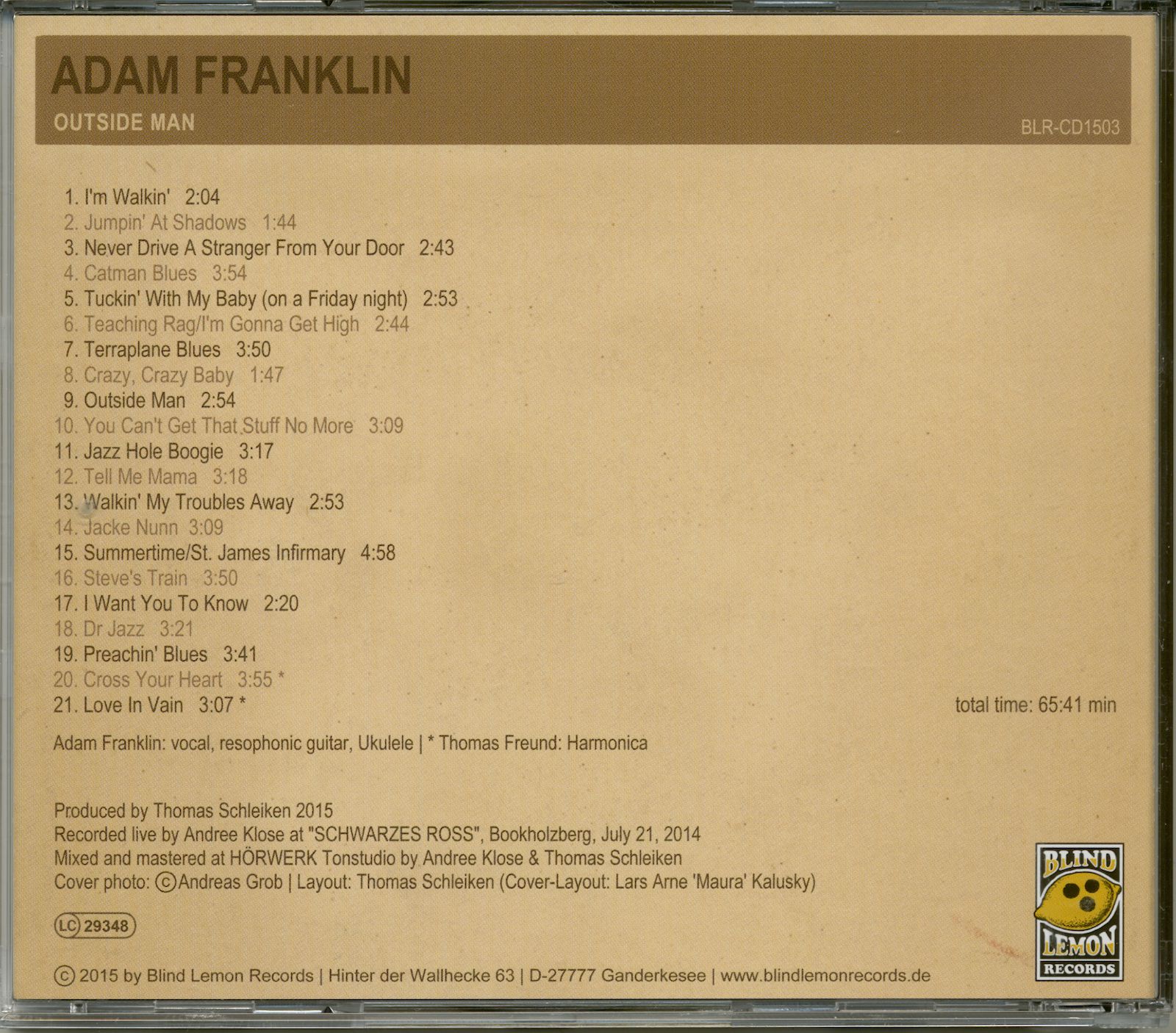 Adam Franklin - voc, resophonic gtr, ukulele, Thomas Freund - hca on 1 track. Recorded live at 'Schwarzes Ross, Bookholzberg, Germany, 2014.