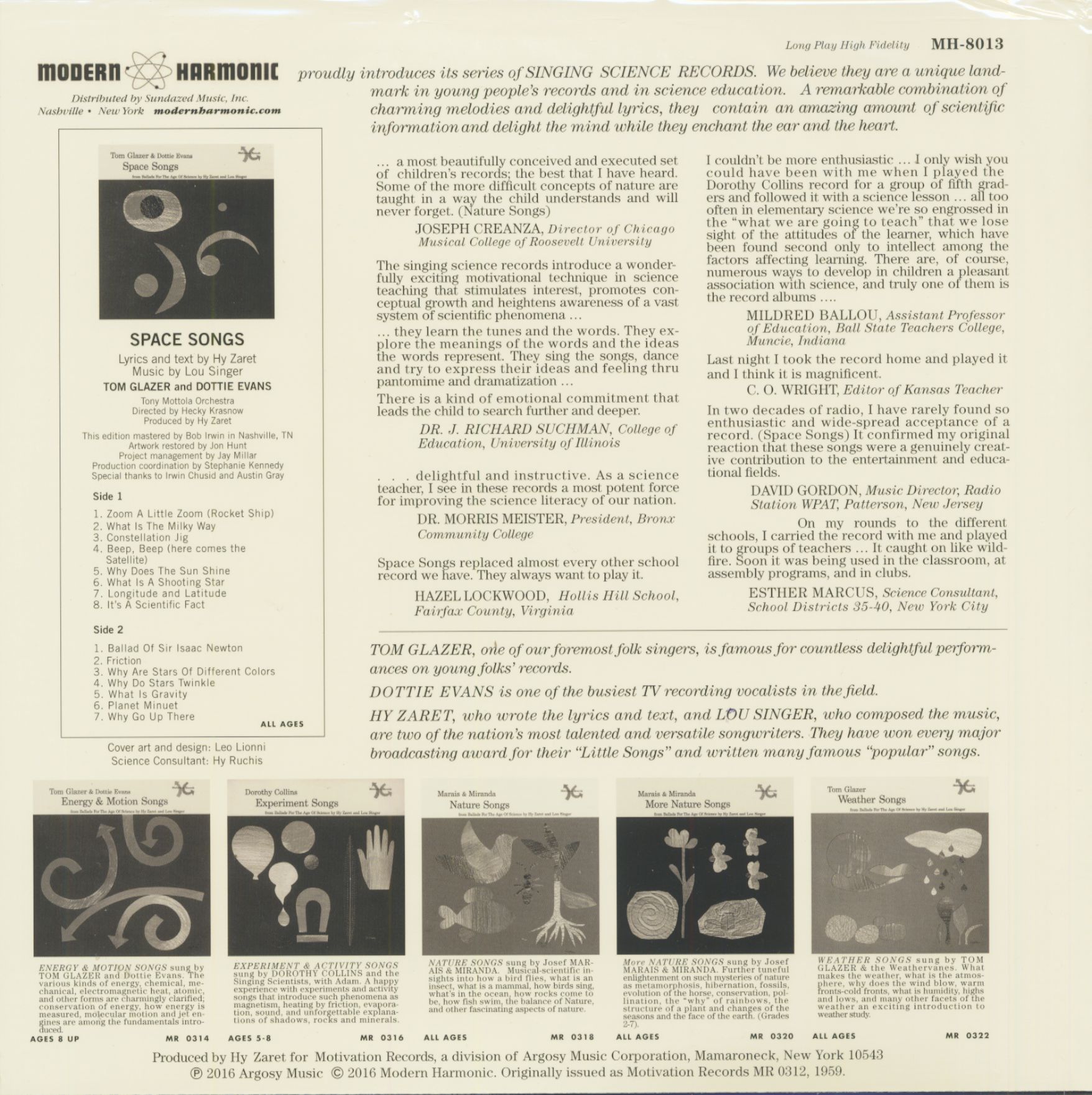 Geschrieben von Hy Zaret und gesungen von Tom Glazer & Dottie Evans. Zaret (Mitautor von'Unchained Melody') widmete sich Ende der 1950er Jahre der Erziehung zur Kindermusik und arbeitete mit Lou Singer an einer Serie von sechs Alben mit dem Titel'Ballads for the Age of Science'. Space Songs steht allein als wichtigster Band in einer Reihe, die auch Songs über Energie und Bewegung, Experimente, Wetter und Natur enthielt. Space Songs enthält'Why Does the Sun Shine' (alias'The Sun Is a Mass of Incandescent Gas') und'A Shooting Star Is Not a Star', die in jüngster Zeit von They Might Be Giants popularisiert wurden!