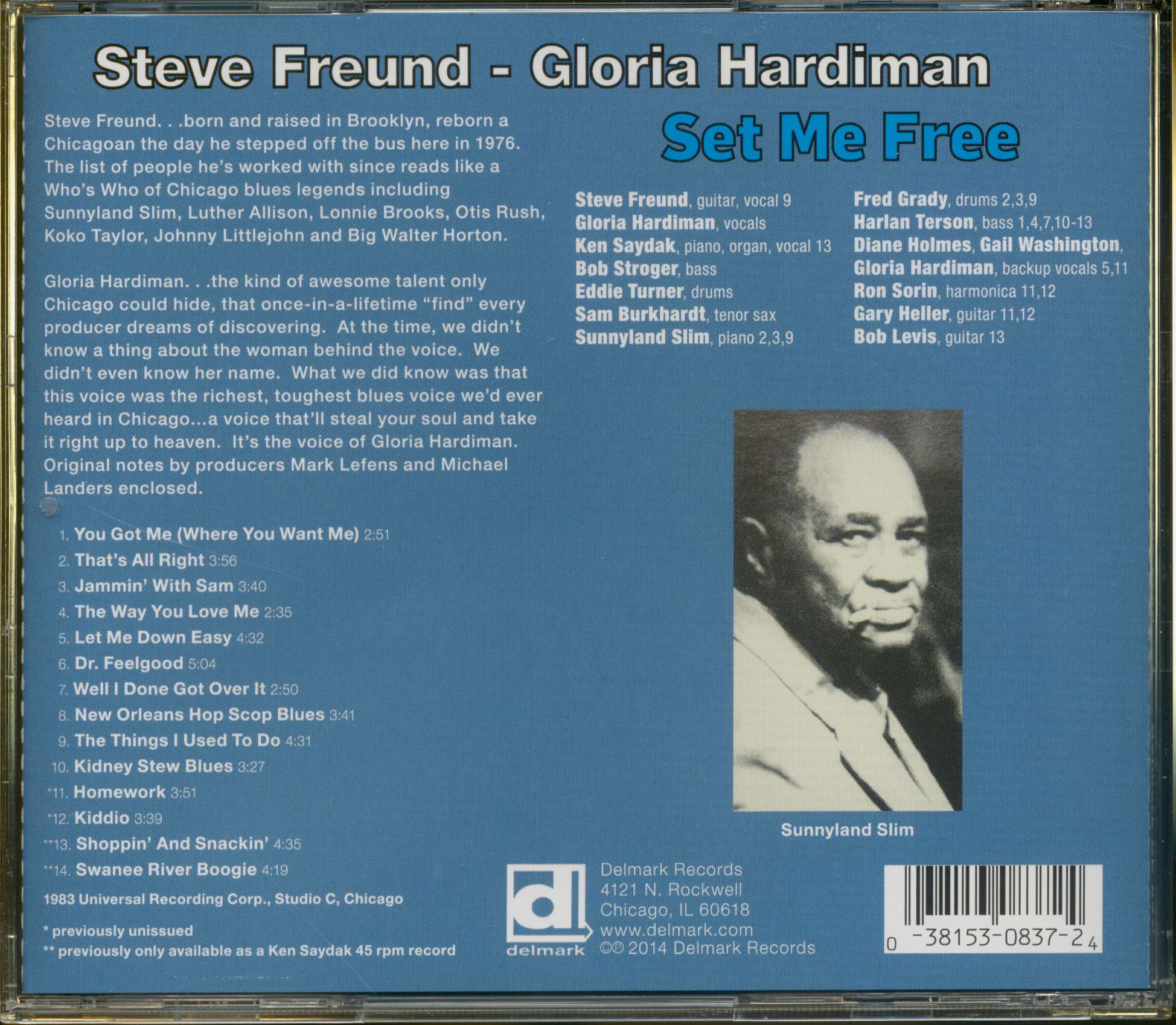 Razor Lp from 1983 plus two unreleased bonus tracks plus two previously published on a Ken Saydeck single, only. Steve Freund - gtr/voc on 9, Gloria Hardiman - voc, Ken Saydack - pno/org/voc on 13, Bob Stroger - bass, Eddie Turner - drums, Sam Burkhardt - sax, Sunnyland Slim - pno on 2,3,9, Fred Grady - drums on 2,3,9, Harlan Terson - bass on 1,4,7,10-13, Diane Holmes, Gail Washington, Gloria Hardiman - backup voc on 5,11, Ron Sorin - hca on 11,12, Gary Heller - gtr on 11,12, Bob Levis - gtr on 13.