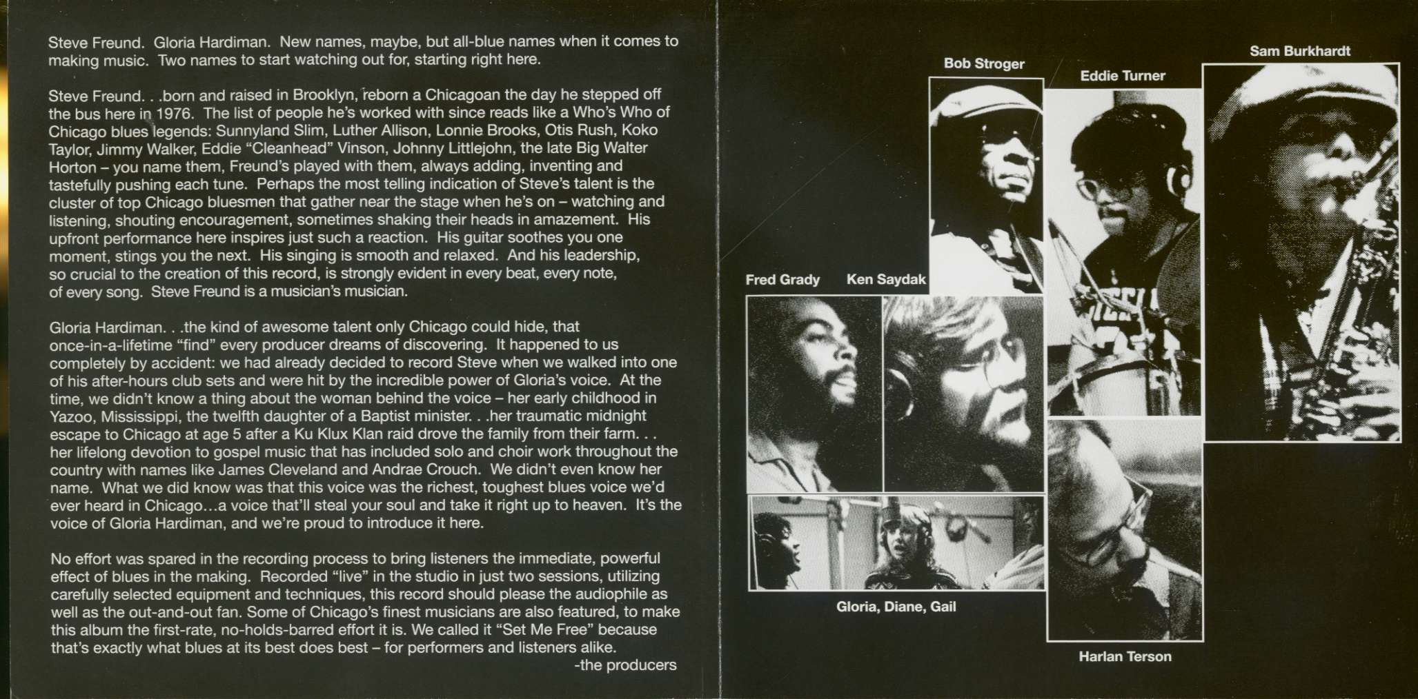Gloria Hardiman - the kind of awesome talent only Chicago could hide, that once-in-a-lifetime "find" every producer dreams of discovering. It happened to us completely by accident: we had already decided to record Steve when we walked into one of his after-hours club sets and were hit by the incredible power of Gloria's voice.