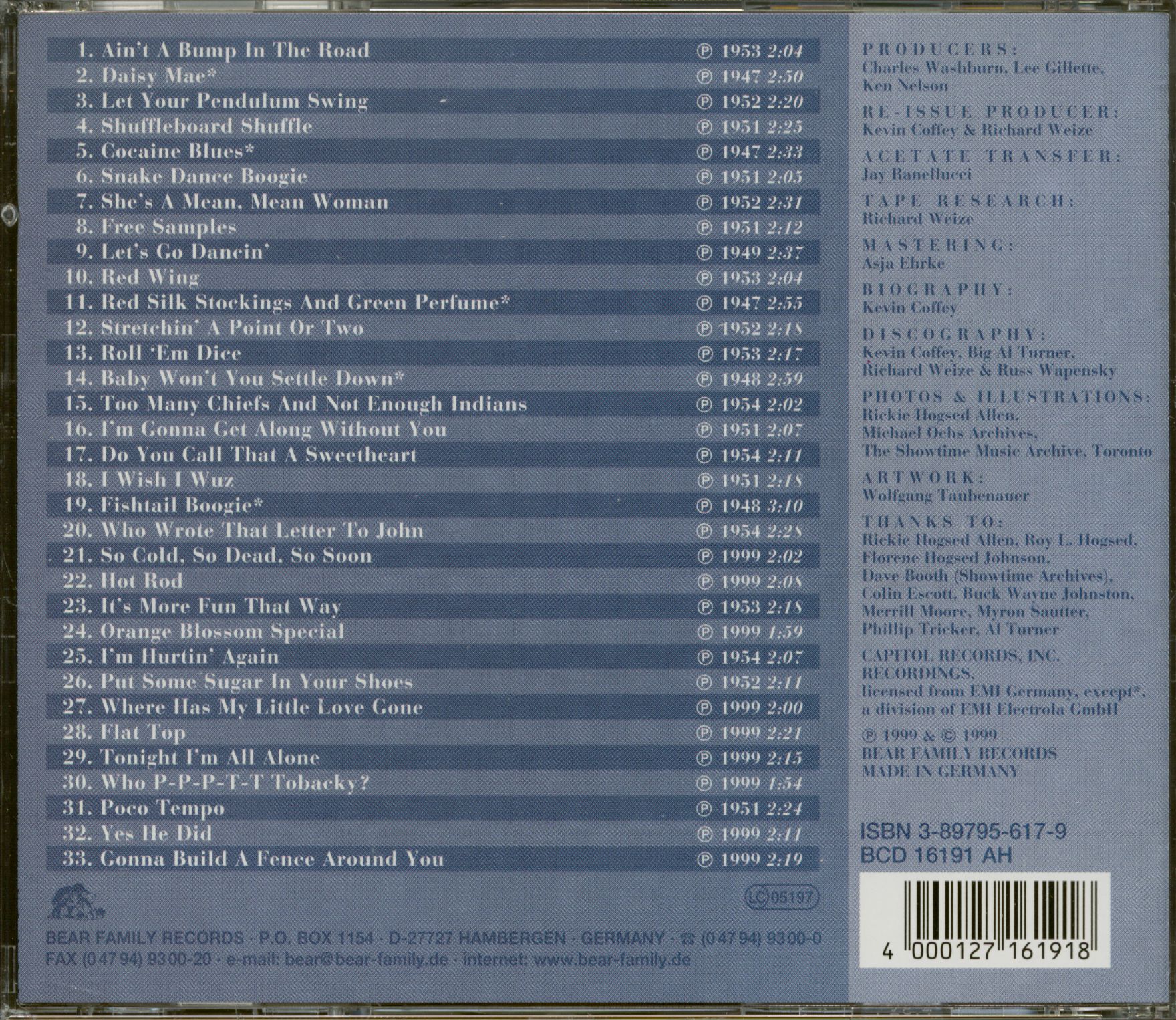 Roy Hogsed (1919-1978) forged one of the most original sounds in postwar country music, a tight and exciting small group sound that often anticipated the energy and drive of rockabilly and rock 'n' roll. He is best remembered for his hit version of the notorious Cocaine Blues and most identified with the accordion and guitar lead and slapped-bass rhythm of his original Rainbow Riders Trio. Ironically, however, some of his best work, like Snake Dance Boogie, Let Your Pendulum Swing and Ain't A Bump In The Road occurred in a looser, slightly larger band context. A good-time feel and infectious joy characterized his performances from start to finish.