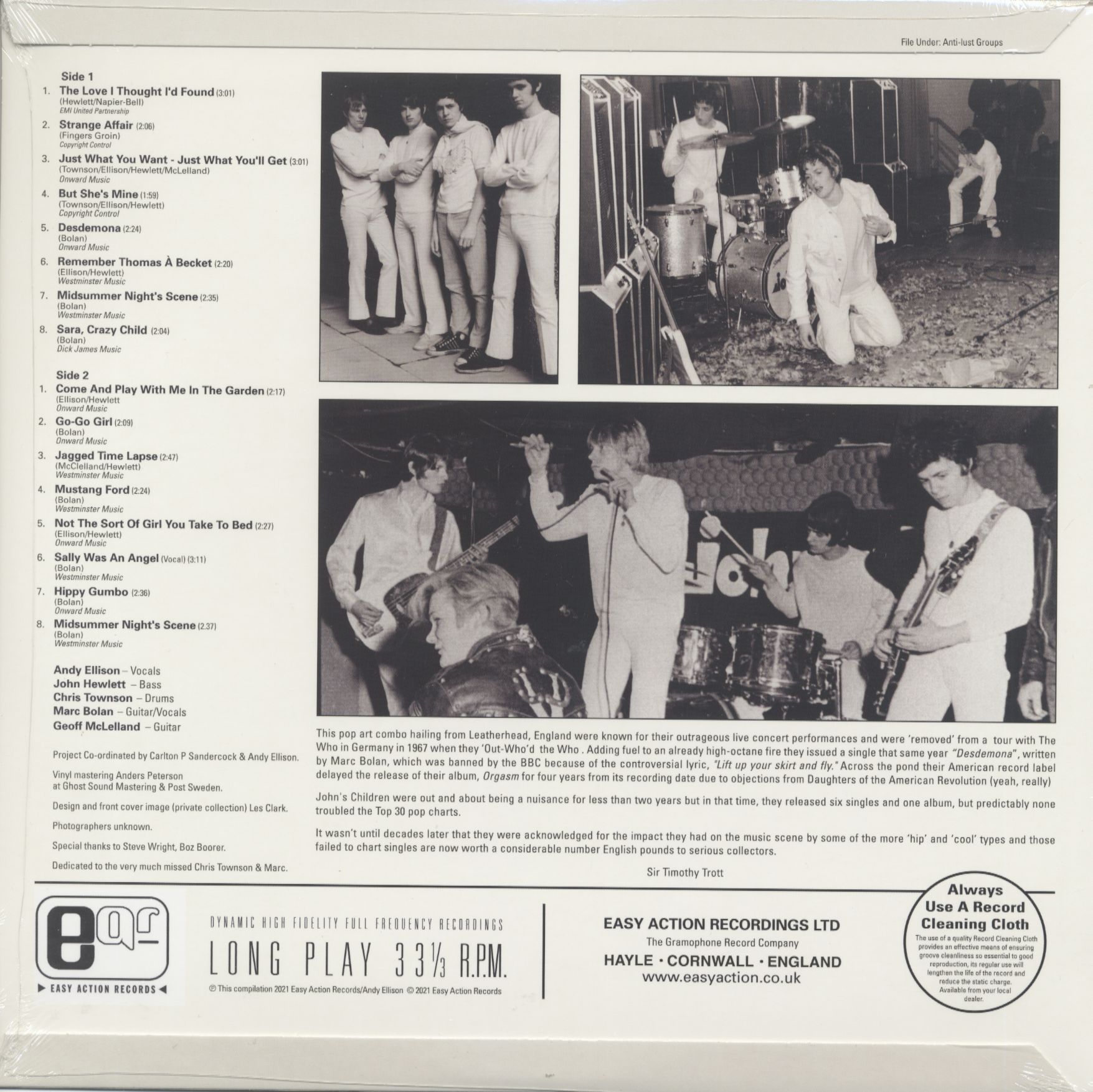 John's Children were on the road for less than two years to annoy, but in that time they released six singles and an album, none of which reached the Top 30 on the pop charts. It wasn't until decades later that the impact they had on the music scene was appreciated by some of the "hip" and "cool" types, and the singles that didn't chart are now worth a considerable number of English pounds to serious collectors - Sir Timothy Trott.