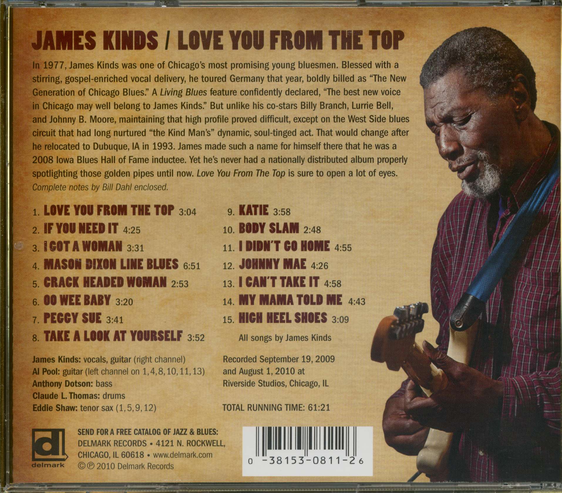 Yet he's never had a nationally distributed album properly spotlighting those golden pipes until this one. Love You From The Top, cut at Delmark's in-house studios, is sure to open a lot of eyes as to what Kinds can do vocally. "I really was wanting to be on the Delmark label:' says James. Eddie Shaw's lusty tenor sax adds to the steamy West Side ambiance on several tracks, just as he did on Magic Sam's classic Delmark album Black Magic more than four decades ago. "Eddie goes way back for me:' says Kinds. "He was one of my mentors:' The prolific Kinds displays a predilection for using ladies' names as song titles ("Peggy Sue," "Katie," "Johnny Mae"), while the set's hard-driving title track stems from personal romantic experience. it was a friend of mine that I was singing about:' he confides.