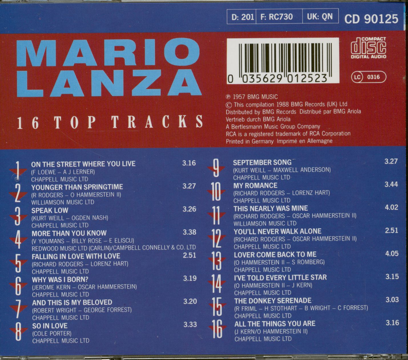 Mario Lanza 16 Top Tracks (CD)