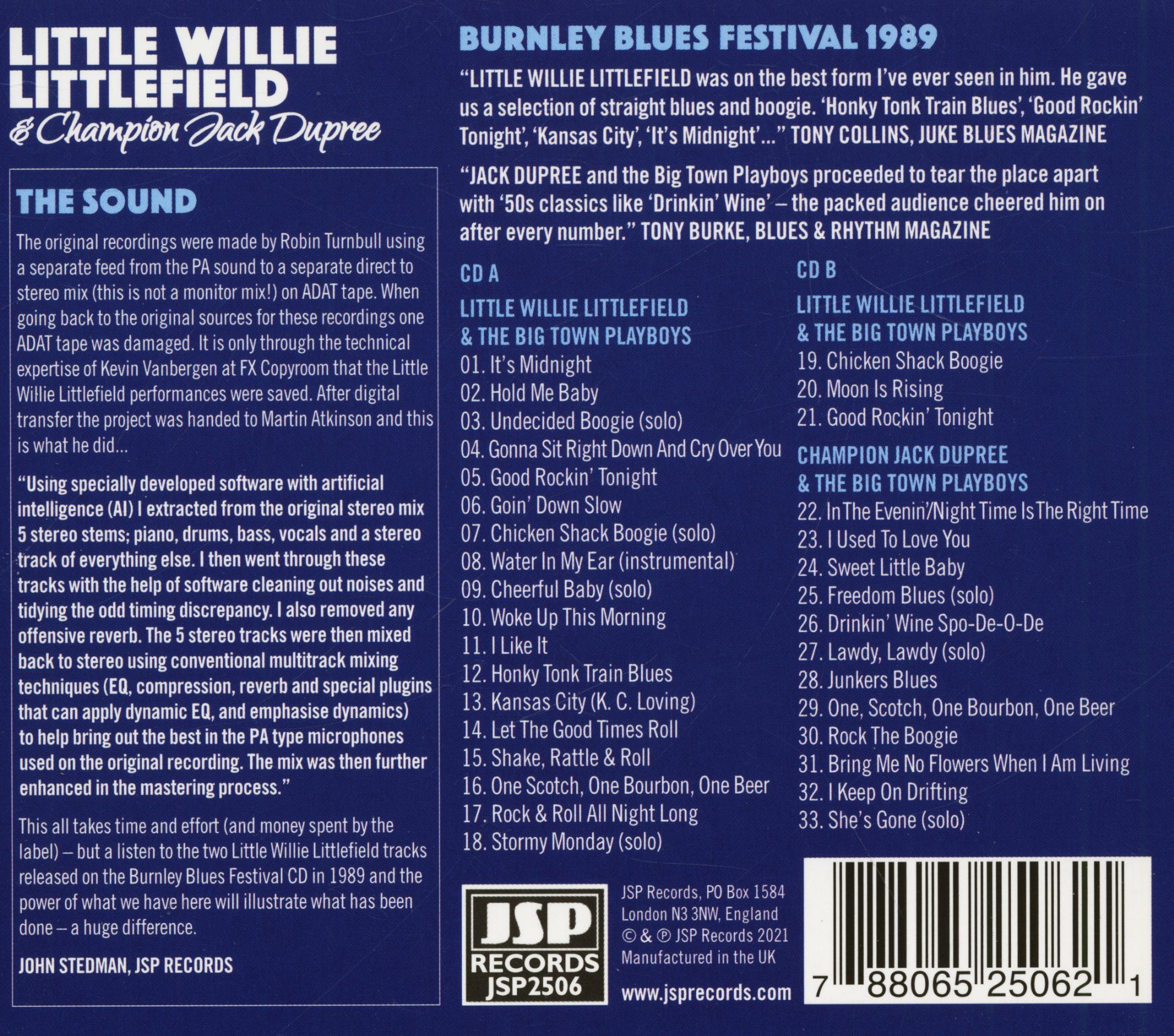 Blues and R&B legends Little Willie Littlefield and champion Jack Dupree had a lot in common. Both had long recording careers stretching back to the 1940s, recording for independent record labels; both chose to live in Europe; both recorded albums in Europe; and both headlined the first-ever Burnley Blues Festival in the United Kingdom in 1989.