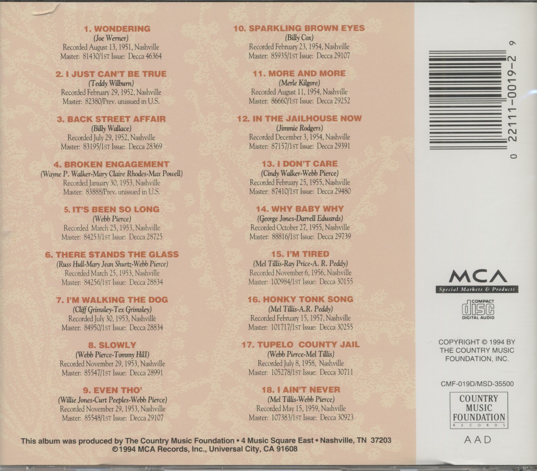 Although the original pressings credited Mel Tillis, this song was adapted from a song of the same name by Tommy Collins, who'd written and performed You Better Not Do That and written Faron Young's hit If You Ain't Loving, You Ain't Living (see our 1954 volume for both). Collins was a troubled guy who never seemed able to make the one thousand percent commitment that success seemed to require. In 1959, when this was recorded, he was still on Capitol but hadn't seen a hit for four years. He was studying to become a preacher when Mel Tillis rewrote his 1955 single No Love Have I into one of the biggest hits of 1960. Collins' gentle waltz tempo was replaced by the same 4/4 rocking beat that Webb had perfected on Tillis' I Ain't Never (see 1959). In Tillis' hands, Collins' hillbilly lament became a country power ballad. The chorus was front-and-center and the growling six-string bass drove the performance. The original chorus, "I'd trade my life for a beggar if he had someone close by his side/Sometimes I can't keep from crying, crying 'cause no love have I," was more self-eviscerating than Tillis's pop-ish rewrite. In fact, there was little similarity between Collins' original and Pierce's record, but just enough for Collins' publisher, Capitol's Ken Nelson, to make a fuss. When Buck Owens recorded No Love Have I as part of his Collins tribute LP in 1963, he used the original words and original waltz time (Buck had been a session guitarist on Collins' earliest records), and when Collins re-recorded No Love Have I for Columbia one year later, he set his original lyrics set to a walking 4/4 rhythm. Later, of course, Collins became a songwriter in residence for Merle Haggard.