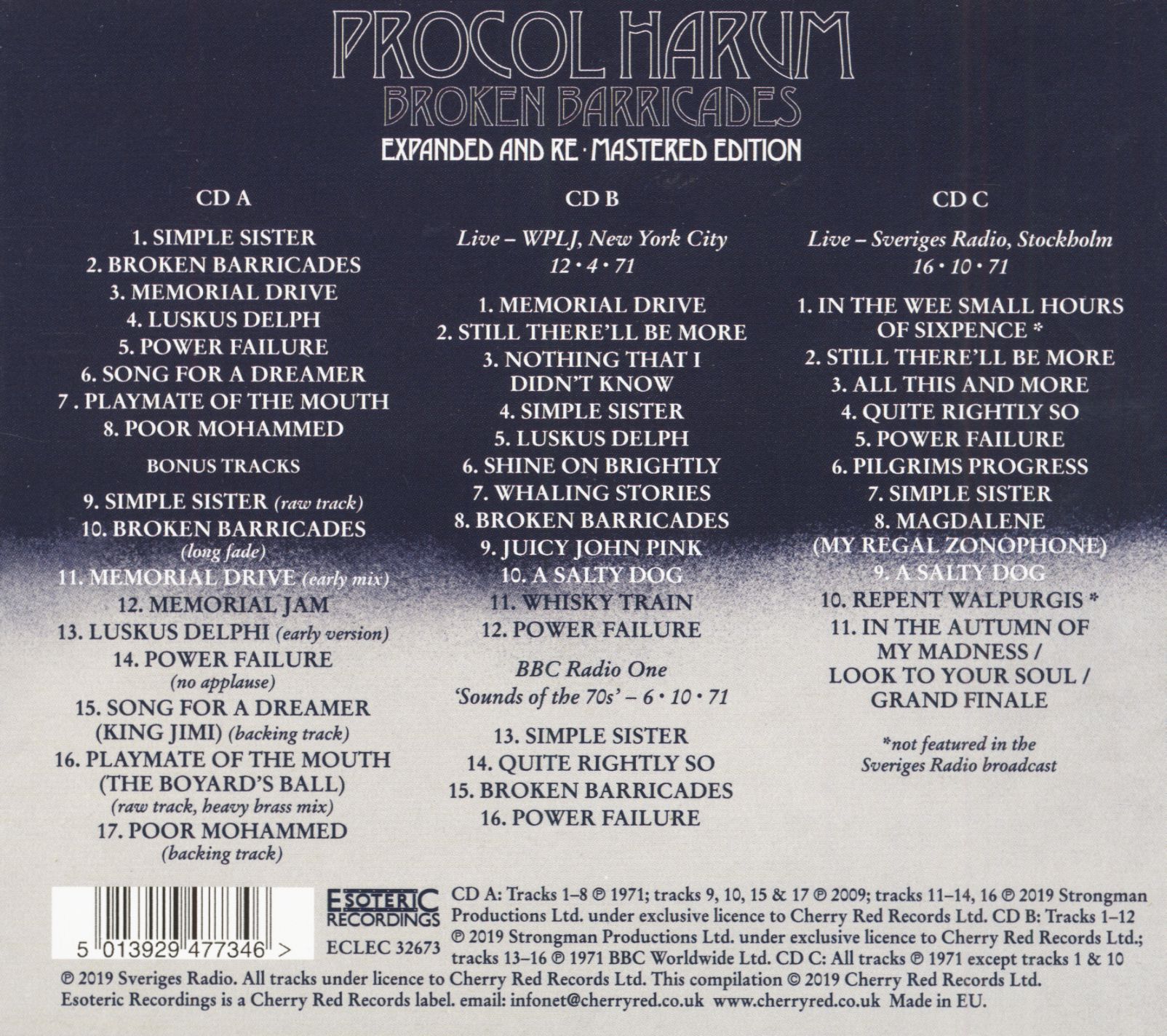 This extended edition of the album has been remastered and contains 36 bonus tracks (32 of which are previously unreleased). This includes the complete previously unreleased live concert for WPLJ FM in New York City in April 1971 (one of the last live recordings with Robin Trower in the band), the entire session for the BBC Radio One show "Sounds of the 70s" in October 1971 and a previously unreleased Swedish radio concert in Stockholm in October 1971. The publication includes a richly illustrated brochure with material from Gary Brooker's personal archive and an essay by Procol Harum authority Roland Clare with exclusive comments by Gary Brooker, Robin Trower and Keith Reid.