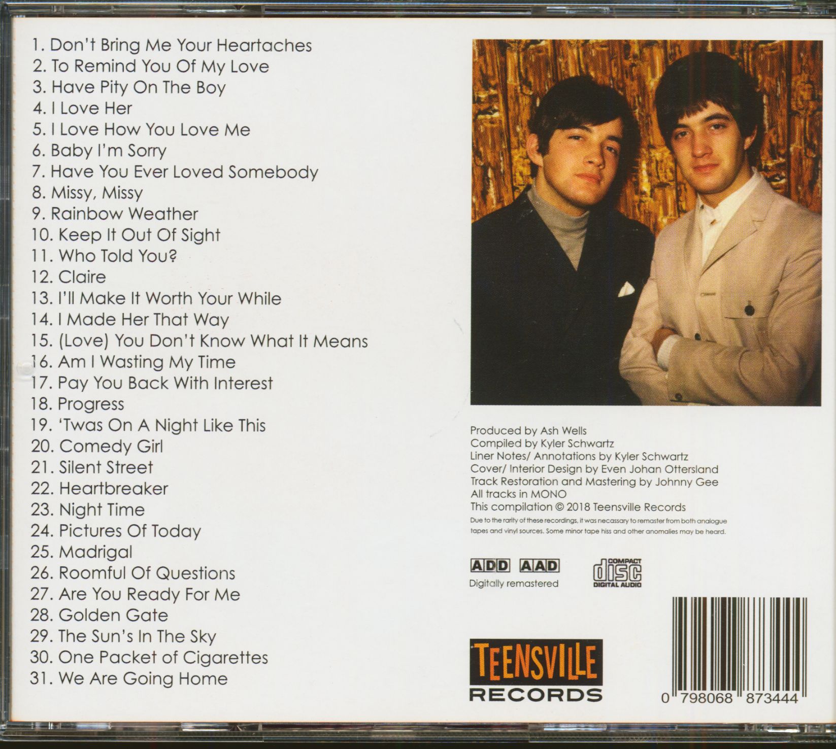 The Ryan twins moved briefly to the MGM label for their last two singles of the decade (together, that is). The slightly cabaret "Heartbreaker" and the sleepy psych-pop of "Night Time" (written by Chris Curtis and Sharon Sheeley) came first in October '67 followed by the collector's favorite pairing of "Pictures Of Today" and "Madrigal" in the early months of 1968, which continued the psych-pop experimentation. Sadly, the singles weren't selling, and in a strange move, MGM released a self-titled album in such limited quantities that many collectors don't even know of its existence. Again, the album featured no singles. It is uniformly excellent, and features a variety of styles, from freakbeat to music hall.