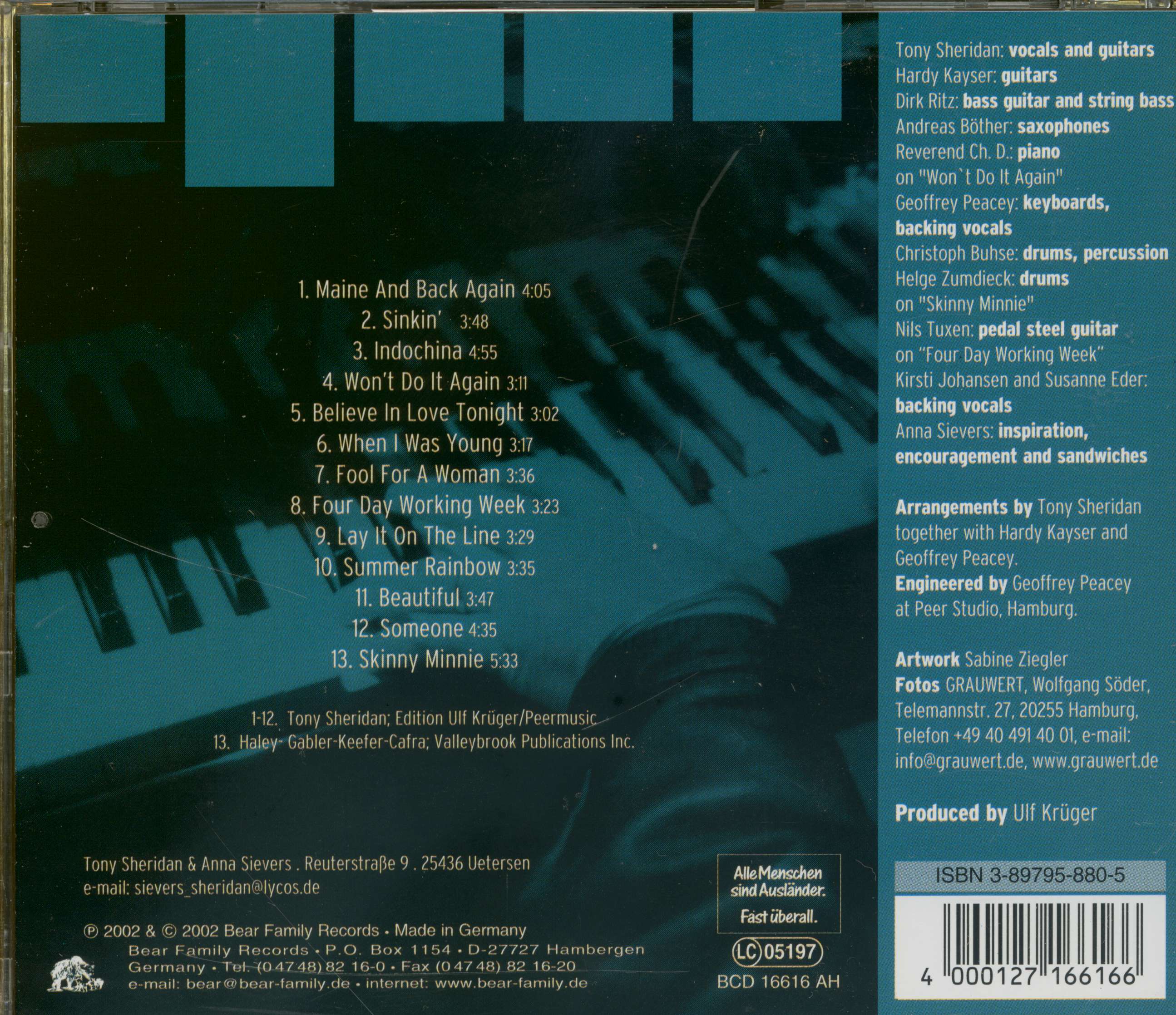 The songs presented here were all written by Tony, with one exception: "Skinny Minnie". At the initial meeting in the studio, as we were just feeling each other out, I jokingly suggested that we try a loose version of "Skinny Minnie", with absolutely no intention of ever releasing the result. The tape was so convincing that we decided to work more on it with a view to issuing a bonus track. I am certain that this version serves admirably to bridge a gap between the "then" and "now", and thus will delight all Sheridan fans, whether they knew Tony from the "old days", or have only recently become acquainted with his music. Ulf Kruger