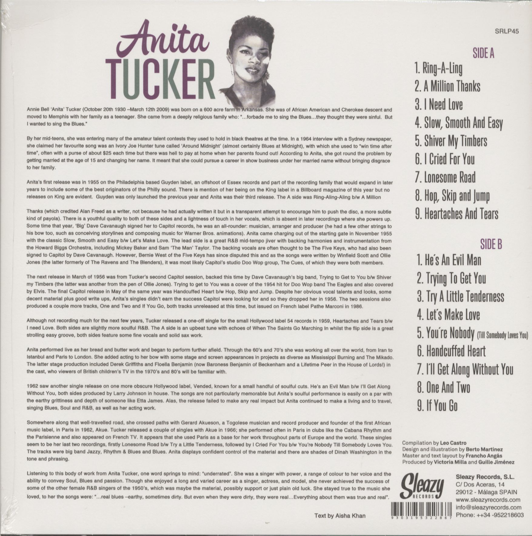 Somewhere along that well-travelled road, she crossed paths with Gerard Akueson, a Togolese musician and record producer and founder of the first African music label, in Paris in 1962, Akue. Tucker released a couple of singles with Akue in 1966; she performed often in Paris in clubs like the Cabana Rhythm and the Parisienne and also appeared on French TV. It appears that she used Paris as a base for her work throughout parts of Europe and the world. These singles seem to be her last two recordings. firstly Lonesome Road b/w Try a Little Tenderness, followed by I Cried For You b/w You're Nobody Till Somebody Loves You. The tracks were big band Jazzy, Rhythm & Blues and Blues. Anita displays confident control of the material and there are shades of Dinah Washington in the tone and phrasing.