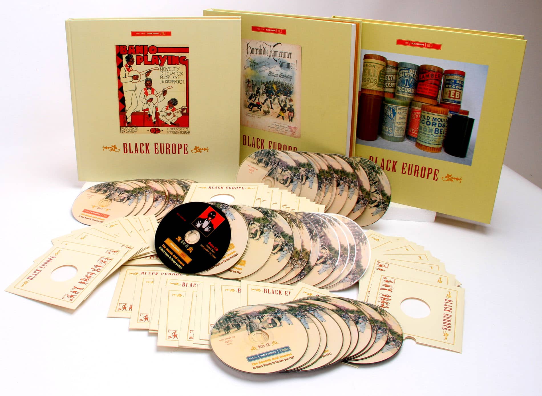 Collected in two 12 x 12 inch coffee table book with almost 600 full-colour pages, here is a multitude of documents, artefacts and curiosities, from passport applications, personal memorabilia and letters, to sheet music, newspaper ads and fabulous poster art, complemented by contemporary postcards and images of wax cylinders and disc records. In more than 100 chapters the life and times of these pioneering entertainers, musicians and linguists comes to life, from early film and sound examples to best-selling 78 rpm records, from ‘human zoos’ and minstrel shows to ethnological documentation and portraits of the (sometimes dubious) movers and shakers in European showbusiness of the time.